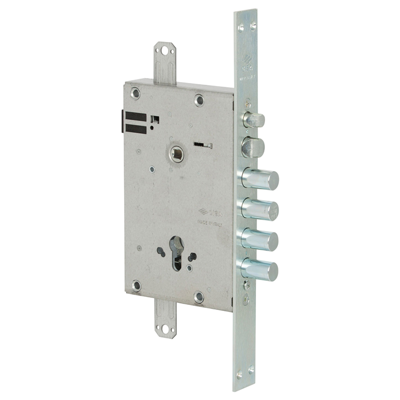 Видимая лицевая планка замка выполнена из нержавеющей стали, стальные никелированные механические ригеля, оцинкованный корпус.
