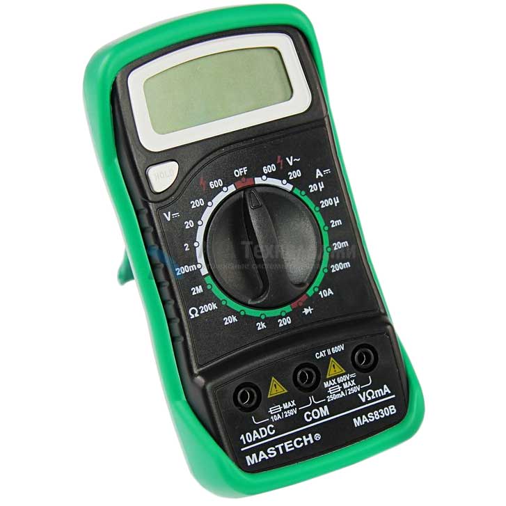 MAS830B – электроизмерительный прибор, измеряет постоянное и переменное напряжение, постоянный ток и сопротивление в цепи. С помощью данного прибора можно проводить тестирование диодов.