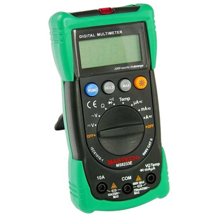 MS8233E – электроизмерительный прибор, измеряет постоянное и переменное напряжение, а также постоянный и переменный ток, сопротивление в цепи и температуру. С помощью данного прибора можно проводить тестирование диодов и осуществлять прозвонку целостности цепи. Мультиметр оборудован специальным датчиком, с помощью которого вы бесконтактно сможете определить, есть ли напряжение на участке.