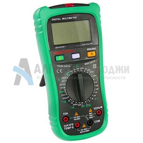 Mastech MS8360C – профессиональный цифровой мультиметр измеряет постоянное и переменное напряжение, а также постоянный и переменный ток, сопротивление в цепи, емкость, частоту и температуру. С помощью данного прибора можно проводить тестирование диодов, прозвонку целостности цепи и измерение коэффициента усиления транзисторов. Также мультиметр оборудован специальным датчиком, с помощью которого бесконтактно можно определить, есть ли напряжение на участке. Таким образом, один прибор сможет заменить сразу несколько устройств одновременно.