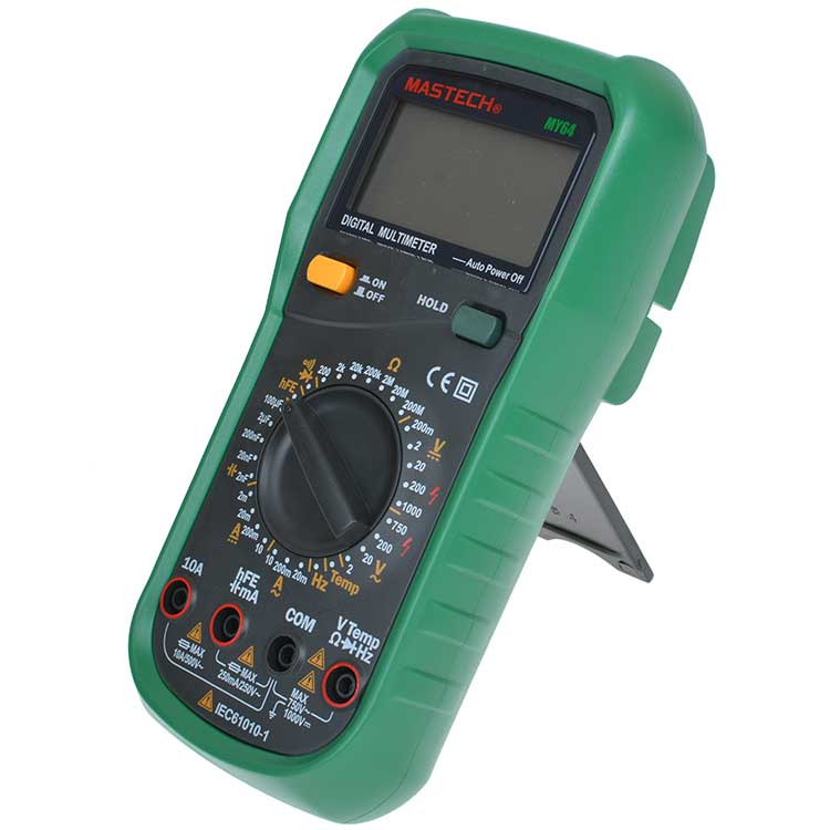 Mastech MY64 – цифровой мультиметр измеряет величины силы постоянного и переменного тока, постоянного и переменного напряжения, сопротивления, коэффициента усиления биполярных транзисторов, емкость конденсаторов, температуру окружающей среды и частоту синусоидального сигнала в звуковом диапазоне. Высокое входное сопротивление не вносит погрешности при измерениях величин и говорит о высокой точности прибора. В приборе применен АЦП с измерением значений методом двойного интегрирования. Выбор пределов измерения величин производится вручную путем установки нужного положения многопозиционного переключателя.