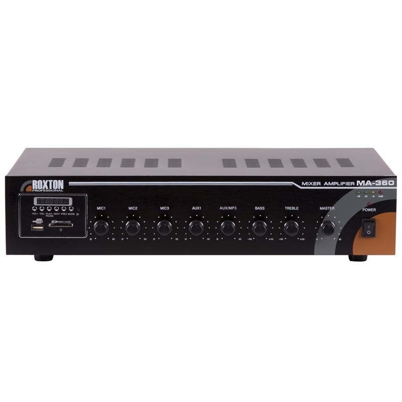 MA-360 – трансляционный микшер-усилитель мощностью 360Вт – решение для систем речевого оповещения и музыкальной трансляции, который в первую очередь предназначен для фонового озвучивания помещений. Два линейных и три микрофонных аудиовхода на задней панели дают широкий выбор источников аудиосигнала, а дополнительные низкоомные аудиовыходы позволяют подключать к усилителю акустические системы бытового и профессионального уровней.