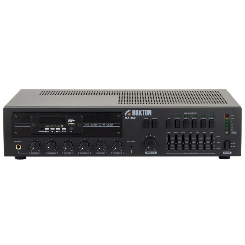 MX-360 – комбинированный усилитель класса D мощностью 360Вт позволяет строить многозонные системы речевого оповещения и музыкальной трансляции. Пять линейных и семь микрофонных аудиовходов, с индивидуальными регуляторами громкости, фантомным питанием и тремя уровнями приоритетов, дают широкий выбор источников аудиосигнала, а встроенный аудио проигрыватель с поддержкой внешних USB/SD накопителей и FM тюнер, расширяют мультимедийные возможности усилителя.