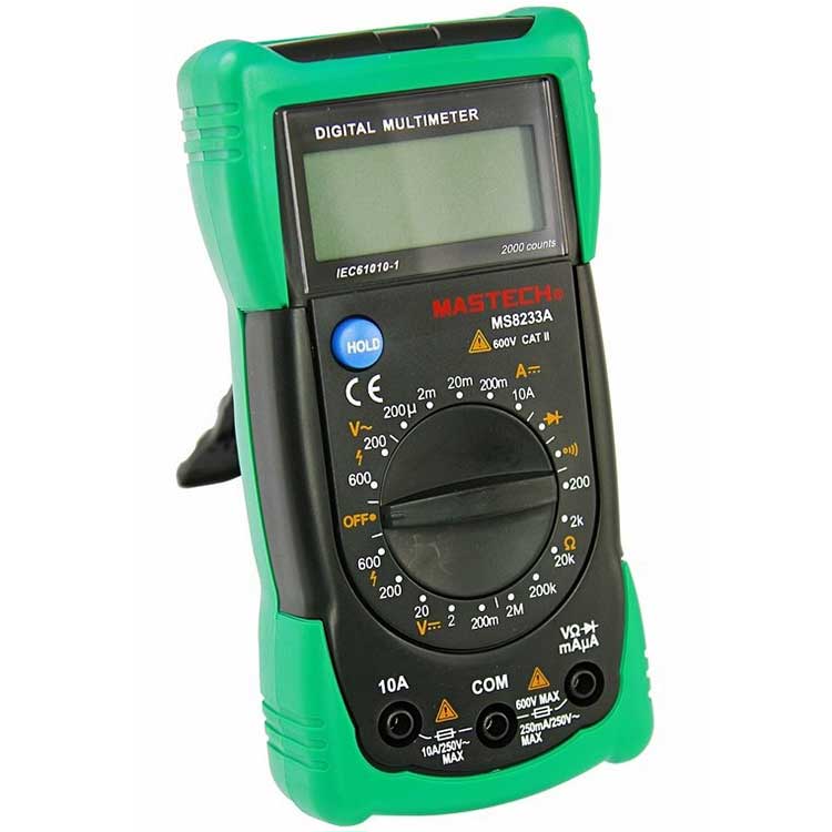 MS8233A – электроизмерительный прибор, измеряет постоянное и переменное напряжение, а также постоянный ток и сопротивление в цепи. С помощью данного прибора можно проводить тестирование диодов и осуществлять прозвонку целостности цепи.