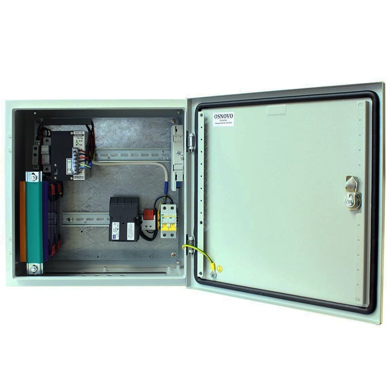 OS-44TB1 – базовая уличная станция с термостабилизацией, резервным питанием и оптическим кроссом. Промышленный БП DC48V (240W), АКБ 48В (2 Ач). Защита АКБ от глубокого разряда.