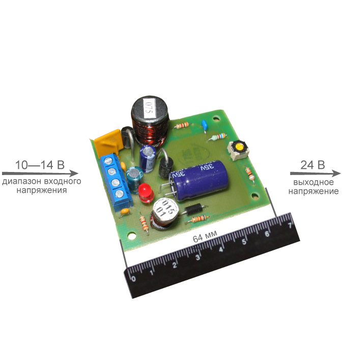 ПН-12/24-1,0 – преобразователь напряжения, встраиваемый модуль на печатной плате размером 52х64x30 мм, преобразует нестабилизированное входное напряжение от 10 до 14В постоянного тока в выходное стабилизированное напряжение 24В постоянного тока для питания нагрузки с током потребления до 1А.