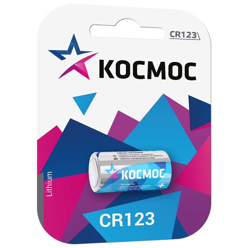 Космос CR123 1BL – литиевая батарейка 3 В. В связи с морозостойкими качествами, и способностью выдерживать большие токи, применяется в тактических фонарях, фототехнике, туристическом снаряжении и сигнализациях.
